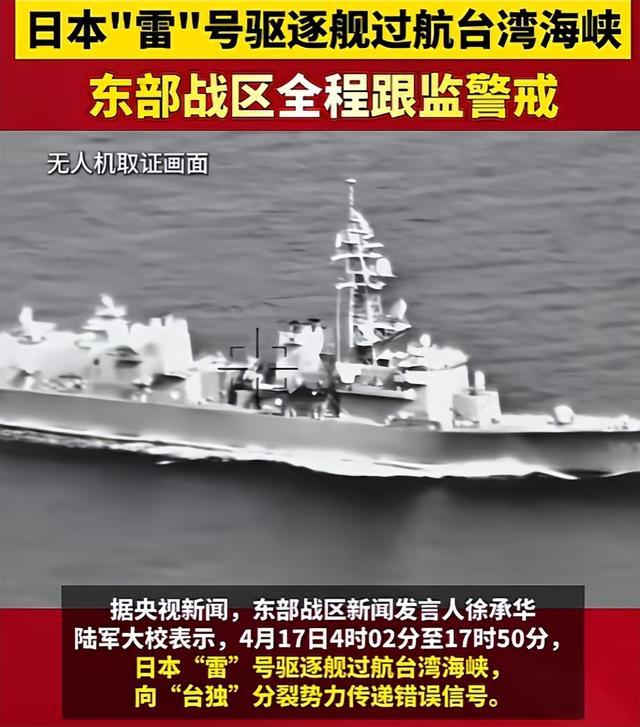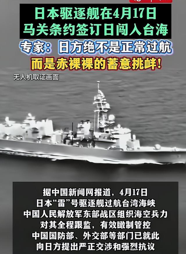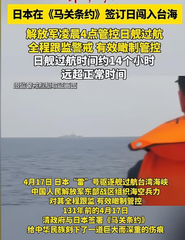就在管制持续进行之际,4月17日日本海上自卫队"雷"号驱逐舰在《马关条约》签署131周年当天,耗时近14小时低速穿越台湾海峡,全程关闭卫星信号,刻意隐蔽行踪。